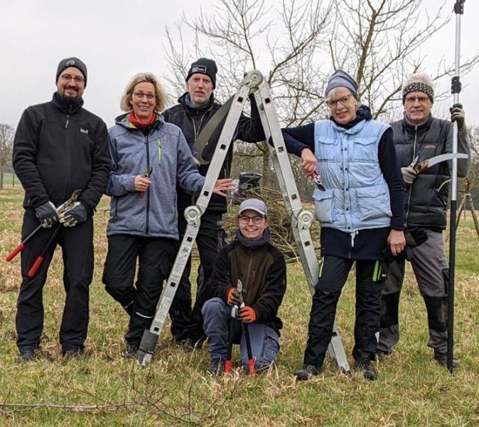 Unsere Gruppe hat sich im Sommer 2022 zusammengefunden. Nach der Besichtigung einiger Streuobstwiesen und der Einweisung in den Obstbaumschnitt, haben wir unsere Arbeit aufgenommen. Wir treffen uns vorwiegend in den Wintermonaten in unregelmäßigen Abständen und kümmern uns um das Beschneiden der Äpfel-, Birnen-, Pflaumen- und Kirschbäume. Wobei die Kirschbäume eher im Sommer nach der Ernte geschnitten werden.
