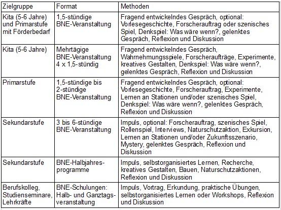 Darüber hinaus lernen die Teilnehmenden durch Rollenspiele, Lernen an Stationen, Beobachten und Messen in der Natur, Naturschutzaktionen, Gelenkte Gespräche, Interviews, Recherche, Zukunftsszenarien Problemstellungen zu erkennen und zu beschreiben. Das Präsentieren der Ergebnisse führt zur gemeinsamen Reflexion und Diskussion über Handlungsmöglichkeiten für eine nachhaltige Entwicklung. Die folgende Tabelle gibt einen detaillierten Überblick über den Einsatz der Methoden zur Förderung der Kompetenzorientierung in Abhängigkeit vom Alter und Bildungsgrad der Teilnehmenden sowie dem Format der Veranstaltung.