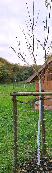 Neben dem Frostschutz wirkt der Kalkanstrich auch als Verbissschutz: Der Geruch und die Struktur des Kalks schrecken Wildtiere wie Rehe ab und verhindern, dass sie an der Rinde nagen.