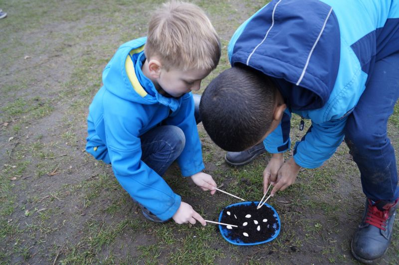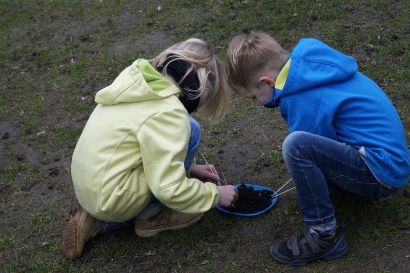 Schwieriger war da schon die Nahrungsaufnahme. Mit zwei Schaschlikspießen Sonnenblumenkerne aus einer Schicht Erde herauszusuchen und sie zwei Meter entfernt wieder abzulegen war für die „Schlauen Füchse“ doch eine ordentliche Herausforderung. Dann schon lieber Sonnenblumensamen und Kürbiskerne in einen Blumentopf setzen und sich auf die Ernte freuen.