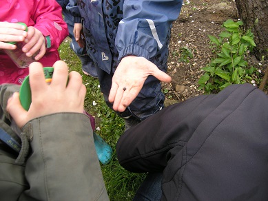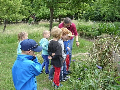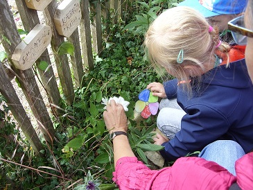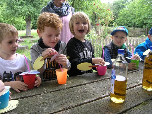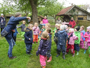 Sehr freundschaftlich ging es im NABU-Lehmdorf zwischen den 20 Kita-Kindern und Ruth Schroer zu. Die angehenden Vorschulkinder des DRK Familienzentrums Burgsteinfurt waren das 1. Mal schon Anfang Mai im Lehmdorf. Jetzt konnten sie die Welt der kleinen Insekten nicht nur mit Becherlupen bestaunen, sondern in der Rolle der Biene auf Entdeckungstour durch die blumenreiche Obstwiese gehen und dabei sogar Nektar schlürfen.