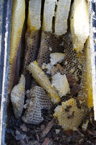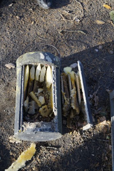 Vor Überraschungen bei der Nistkastensäuberung ist man nie sicher. So fand das 6-köpfige Nistkastenreinigungs-Team vom NABU Ortsgruppe Rheine in einem Nistkasten einen Bienenstaat. Außerdem hatte ein Kleiber die Sommerbehausung bis auf das Einflugloch ordentlich verklebt.
