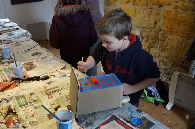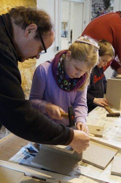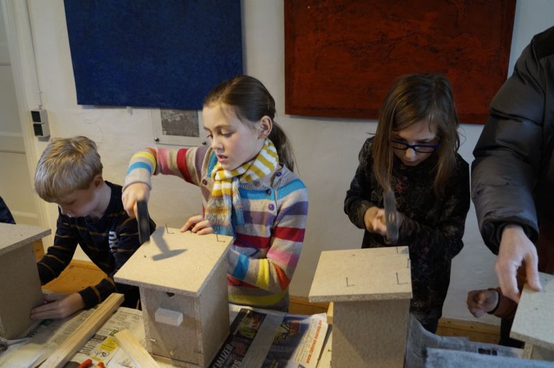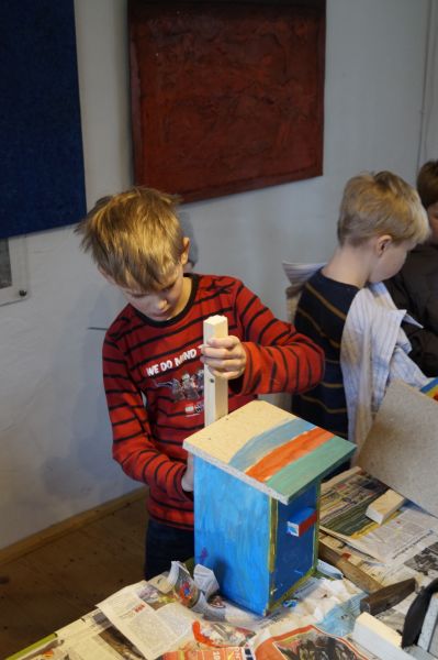 Fünf Betreuer halfen den Kindern dabei, dass die vorgefertigten Bestandteile der Vogelbehausungen korrekt zusammengebaut wurden. Mit Feuereifer hämmerten die Kinder die Holzteile zusammen und bemalten sie anschließend individuell. So entstanden zahlreiche nützliche Kunstwerke, die nun in dem einen oder anderen Garten zu bewundern sind.