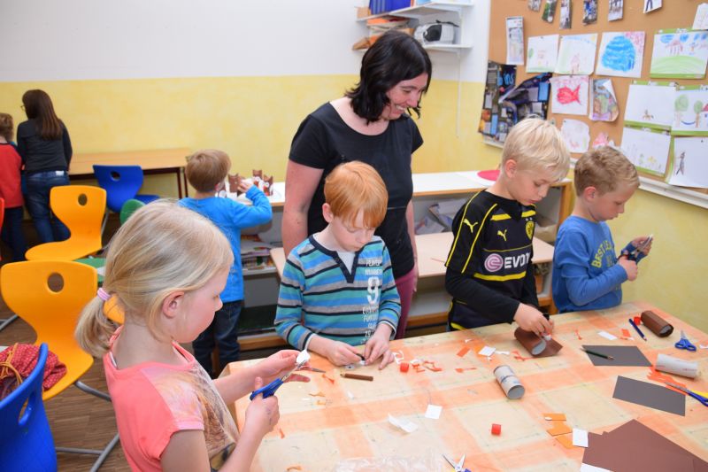 Zum Abschluss des Nachmittages haben Michaele von der Straten und Lars Gremme eine Bastel-Aktion für alle Kinder vorbereitet. Gemeinsam bastelten die Kinder aus Pappe und Papier eigene kleine Eulen für die Fensterbank.
