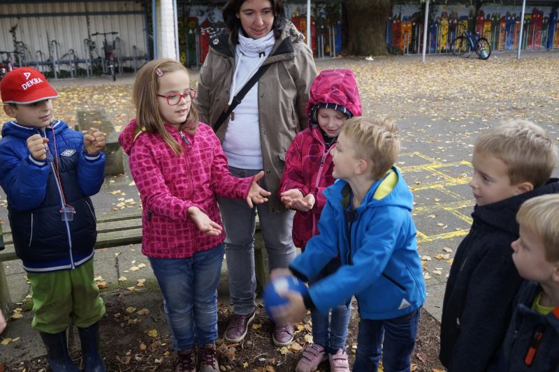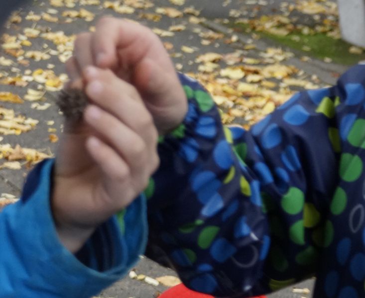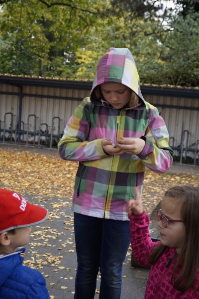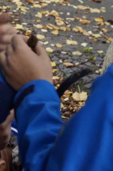 Von den Betreuern Michaele von der Straten und Lars Gremme gut vorbereitete Zuordnungsaufgaben führten zu einer zwar spielerischen aber auch intensiven Beschäftigung mit dem Thema. Manchmal ist es gar nicht so einfach herauszufinden, welche Frucht und welches Blatt zum jeweiligen Baum gehören. Bei Kastanie und Buchecker fiel es den meisten noch leicht, auch Eicheln sind allgemein bekannt und der Baum dazu schnell herausgefunden, aber wer kennt schon Frucht, Blatt und Kronenform des Amberbaumes? So gibt es auch auf dem eigenen Schulhof immer noch Neues zu entdecken. Besonders interessant für die neuen Teilnehmer der NAJU-Gruppe war der Schulgarten. Hier gab es noch trockene Himbeeren zu entdecken und reichlich Kastanien zum Mitnehmen. Die konnten auch gleich eingesetzt werden beim beliebten Eichhörnchenspiel.