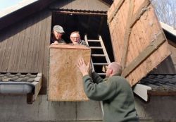 Berthold Prus und Jürgen Wiesmann setzen auf dem Hof Rainer Lastering, Brechte einen Schleiereulen- Kasten um...