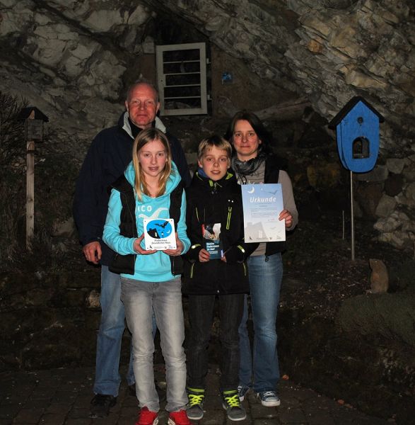 Wolfgang Stegemann, NABU-Artenschutzbeauftragter für Fledermäuse im Kreis Steinfurt überreichte ein Hausschild und eine Urkunde. Die Besonderheit: es ist das erste Mal, dass im Kreis Steinfurt ein Fledermaus-Winterquartier ausgezeichnet wurde. In einem Stollen auf dem Grundstück der Familie Niemeyer überwintern einige Tiere verschiedener Fledermausarten, wie Wasserfledermaus, Fransen-  und Bartfledermaus sowie Braune Langohren. Aufgrund der hohen Luftfeuchtigkeit von 80-90%, dazu frost- und störungsfrei gelten Stollen als optimale Winterquartiere. Sie sind selten, aber unerlässlich für das Überleben der Handflügler.